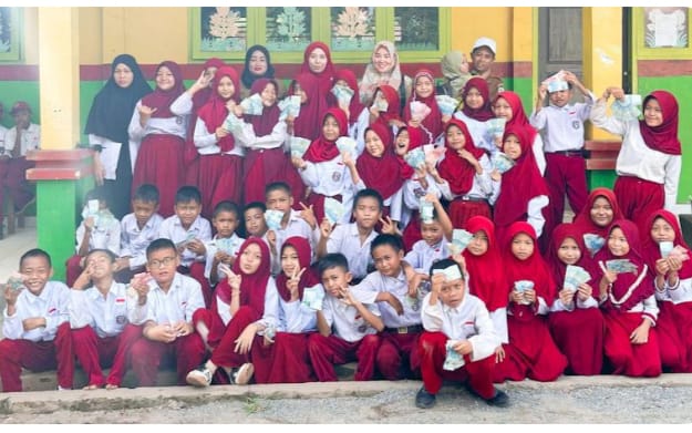 Kebahagiaan peroleh uang saku, para siswa langsung selfie bareng sembari memegang uang saku yang diperoleh.