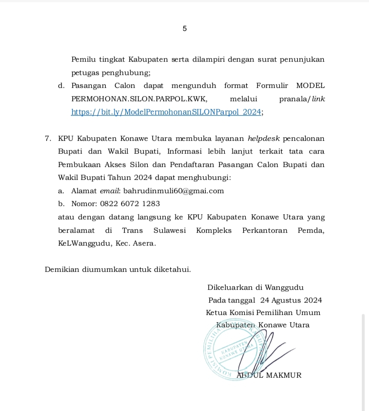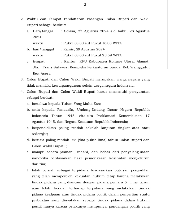 Lintasoheo.com | Konut – Komisi Pemilihan Umum Mengumumkan Pendaftaran Pasangan Calon Bupati dan Wakil Bupati Kabupaten Konawe Utara, (Konut), Provinsi Sulawesi Tenggara(Sultra) Tahun 2024.Dengan NOMOR : 634/PL.02.2-Pu/7409/2/2024.