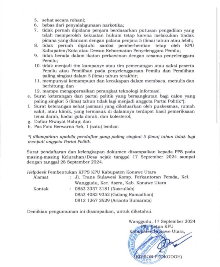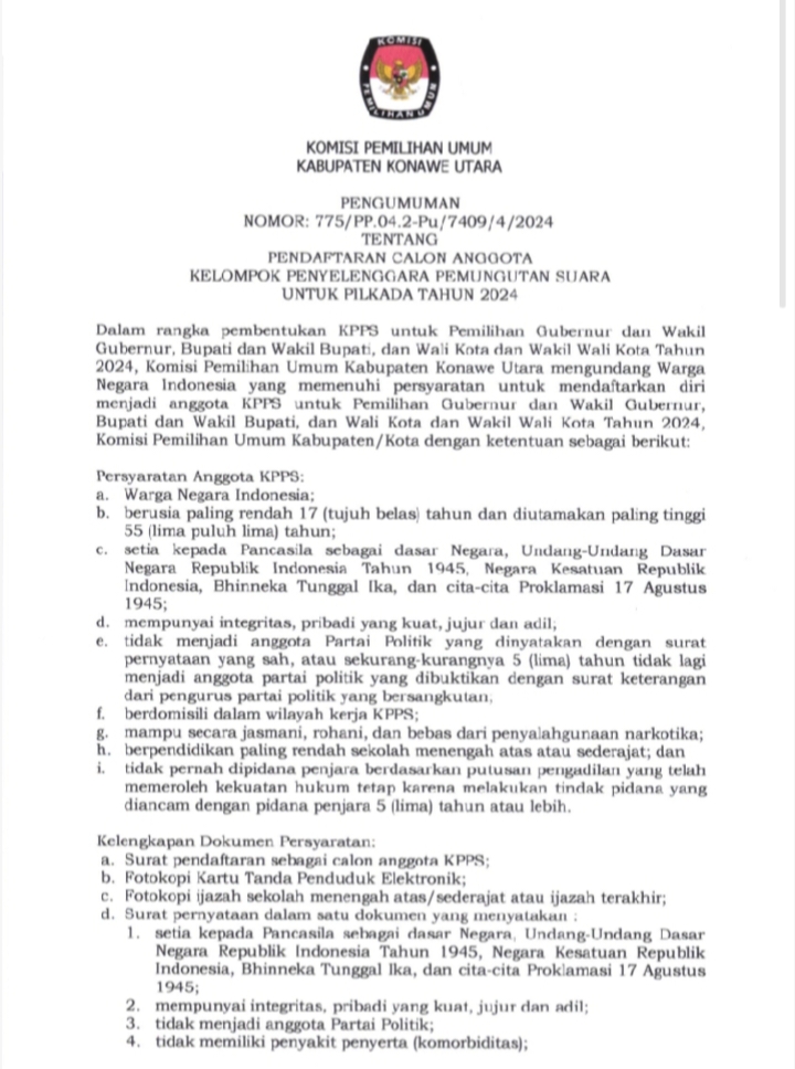 Komisi Pemilihan Umum Umumkan Tentang Pendaftaran Calon Anggota KPPS Untuk Pilkada Konut Tahun 2024 17 September 202417 September 2024oleh Lintas Oheooleh Lintas Oheo Dilihat : 628 BACA JUGA: Polres Konut Ungkap Korban Tenggelam Ternyata Mengidap Penyakit Gangguan Jiwa dan Epilepsi Jangan LewatkanIkbar Temui Wamen Transmigrasi Viva Yoga. Usulkan Pengembangan Kawasan Transmigrasi 19 Ribu HektareDugaan Keterlibatan Oknum Babinsa dalam Kasus Pengeroyokan di Watumelewe DibantahPT Bumi Sentosa Jaya Salurkan 286 Paket Parcel Lebaran untuk Warga Boenaga dan Boedingi PT MLP Salurkan Parcel Lebaran di 5 Desa Lingkar TambangPeringati Hari Gizi Nasional, Bupati Ikbar Buka Bakti Sosial IBI Konut di Puskesmas Asera