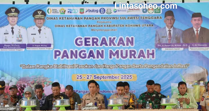 Lintasoheo.com | Konut – Bupati Konawe Utara, H. Ikbar, resmi membuka kegiatan Gerakan Pangan Murah (GPM) yang berlangsung di balai kantor camat Lasolo, Kelurahan Tinobu, Kecamatan Lasolo, Rabu (24/9/2025).
