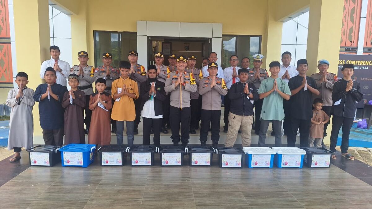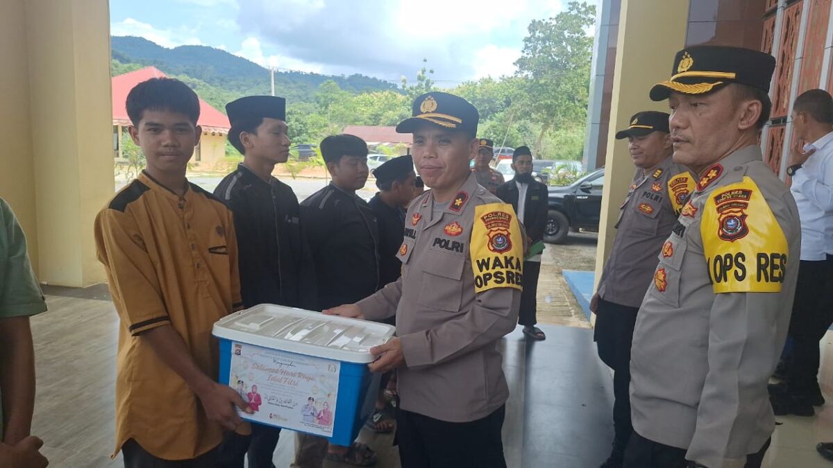 Dipimpin Ustadnya para santri menerima bingkisan yang di serahkan langsung Kapolres Konawe utara AKBP Priyo Utomo bersama Pejabat Utama Polres Konut.
