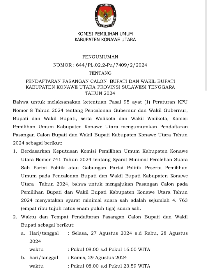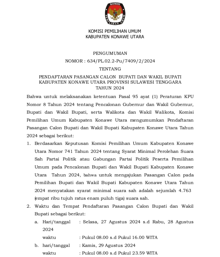 Lintasoheo.com | Konut – Komisi Pemilihan Umum Mengumumkan Pendaftaran Pasangan Calon Bupati dan Wakil Bupati Kabupaten Konawe Utara, (Konut), Provinsi Sulawesi Tenggara(Sultra) Tahun 2024.Dengan NOMOR : 634/PL.02.2-Pu/7409/2/2024.