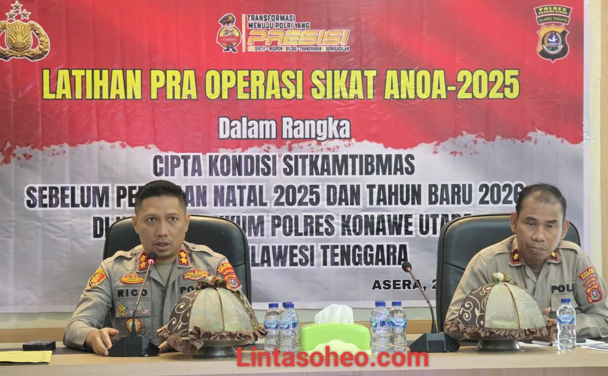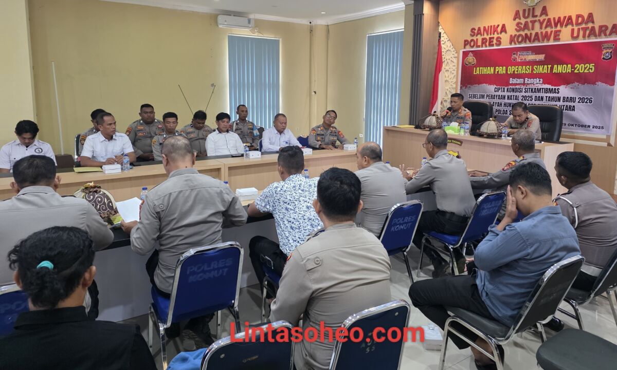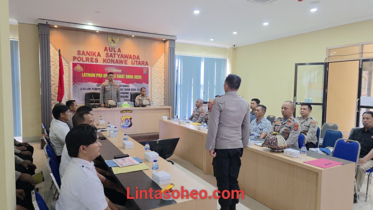 Lintasoheo.com | Konut – Kepala Kepolisian Resor (Kapolres) Konawe Utara, AKBP Rico Fernanda, S.H., S.I.K., M.H., memimpin langsung pelaksanaan Latihan Pra Operasi (Latpraops) Sikat 2025 dalam rangka cipta kondisi (cipkon) keamanan dan ketertiban masyarakat (Kamtibmas) menjelang Perayaan Natal 2025 dan Tahun Baru 2026 (Nataru). Kegiatan ini digelar di Aula Sanika Satyawada Polres Konawe Utara, Rabu (29/10/2025).